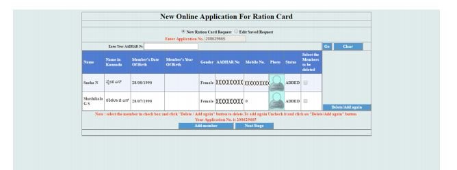 After the addition of members, the Applicant has to click on “Next Stage” Button. The following Screen appears prompting the Applicant to select the Address for the Ration Card and Mobile Number for receiving SMS from the Department.